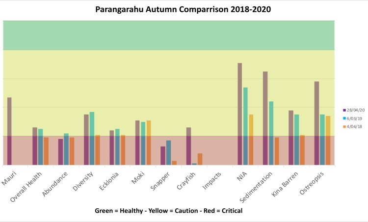 This is our first survey where we have replaced the “Overall Health” assessment line with an assessment of the Mauri. Mauri – an internal energy or life force derived from whakapapa, an essential essence or element sustaining all forms of life. Mauri provides life and energy to all living things, and is the binding force that links the physical to the spiritual worlds (e.g. wairua). It denotes a health and spirit, which permeates through all living and non-living things. All plants, animals, water and soil possess mauri. Damage or contamination to the environment is therefore damage to or loss of mauri. (Harmsworth, Awatere, 2013). This survey comes after five weeks of no fishing, diving or boating, due to the Covid 19 Lockdown rules.